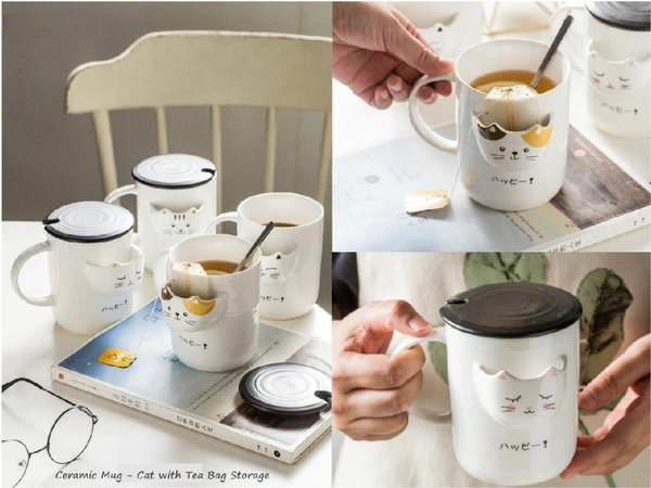 Cat-Themed Ceramic Tea Mug with Built-In Tea Bag Holder, Lid & Spoon - 400ml (1 Piece, Random Design)