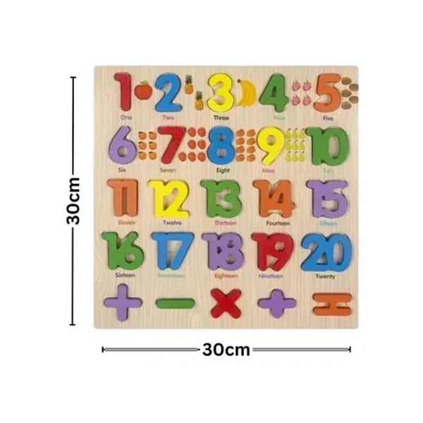 Designed as a wooden numbers and math symbols learning puzzle board to introduce early numeracy concepts through hands-on play.